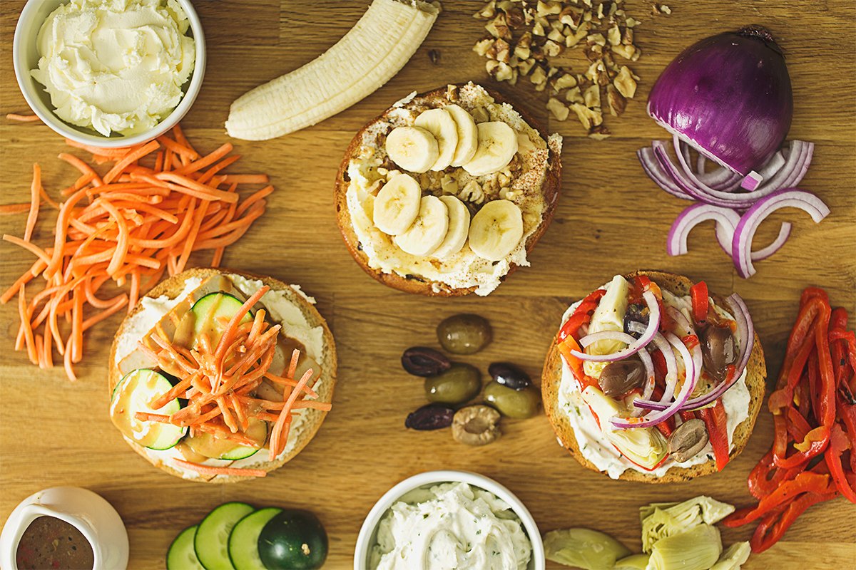 We topped 3 of our awesome gluten-free bagels in 3 styles: Mediterranean, Thai and just like Mom makes.