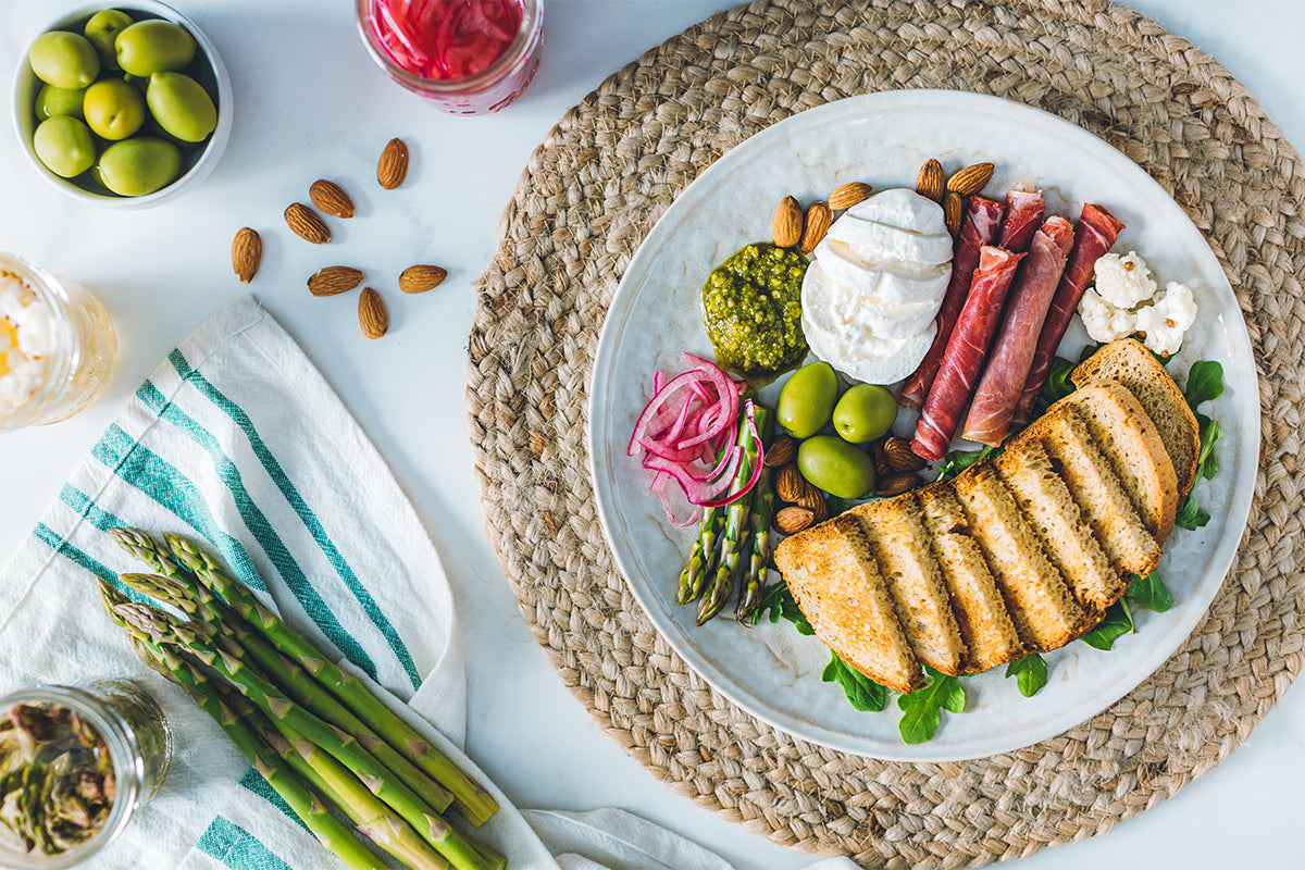 Burrata cheese, pesto and quick-pickled asparagus veggies served alongside fresh greens and toasted Heritage Style bread.