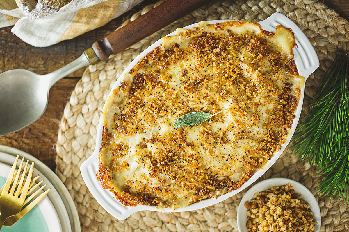Hot bubbly cheese sauce, layers of thin-sliced potatoes, and a crunchy breadcrumb topping.