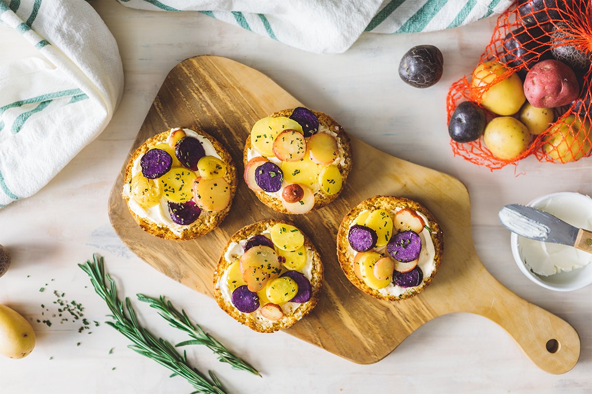 Steamed heirloom baby potatoes, lightly dressed in Dijon vinaigrette with herbs over cream cheese on toasted English muffins.