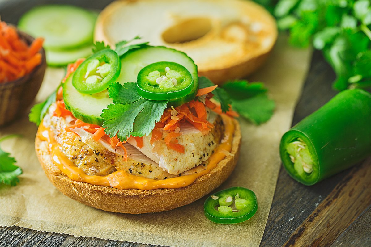 Our Banh Mi Bagel takes the classic Vietnamese sandwich featuring sriracha mayo, crisp cucumber, crunchy carrots, jalapeño, and fresh cilantro.