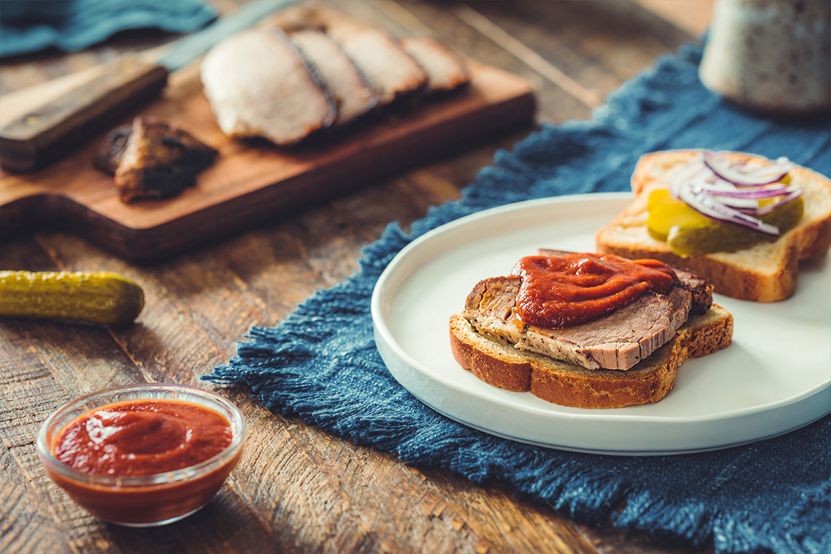 Dry-rubbed beef brisket cooked slowly, sliced thinly and served on toasted Country White bread with homemade BBQ Sauce.