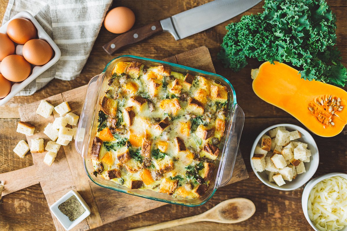 An essential brunch dish, made with eggs, comforting sausage, kale and seasonal butternut squash.