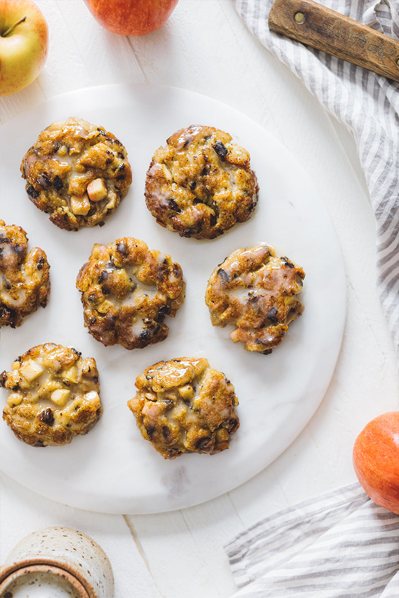 Warm, gooey fritters made with cubed Cinnamon Raisin Bread and cinnamon apple filling, gently pan fried and glazed.