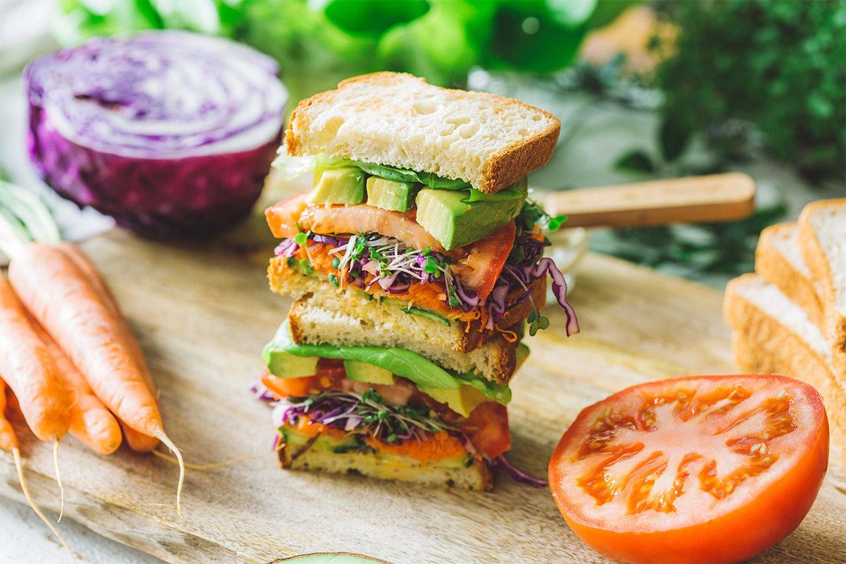 Crisp and cool veggies stacked up in a rainbow of colors on toasted Mountain White bread with fresh basil aioli.