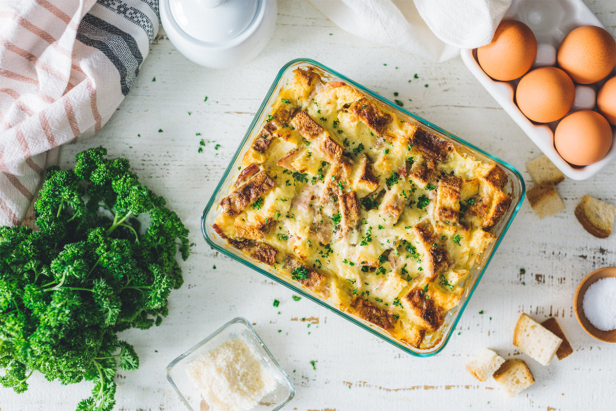 Crispy Country White Bread layered in a baking dish with a creamy Dijon mustard sauce, holiday ham, and golden gruyere cheese.