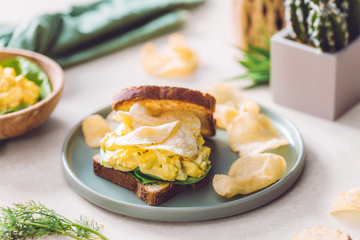 Tangy egg salad layered with potato chips and butter lettuce on Country White bread.
