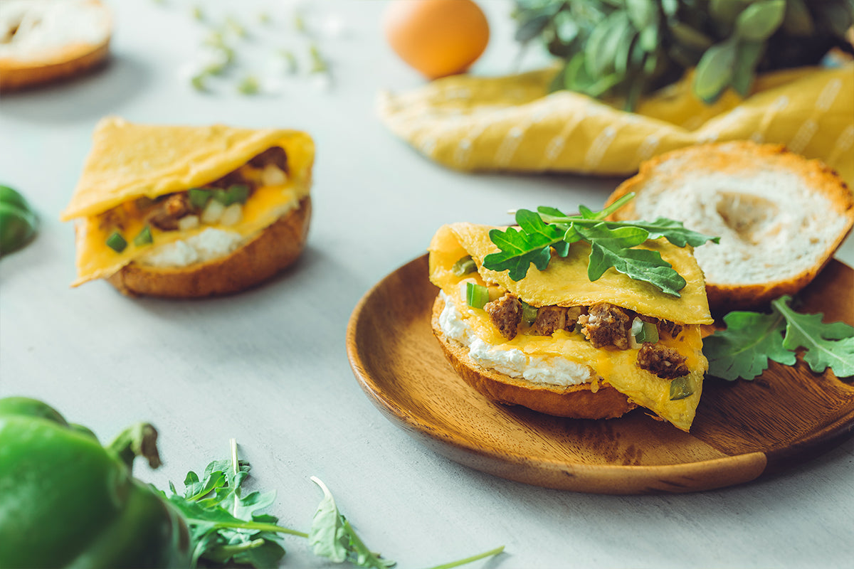 Everyone’s favorite 3-egg omelet packed with veggies and sausage, cooked up golden and served on a Deli White bagel with rich cream cheese.