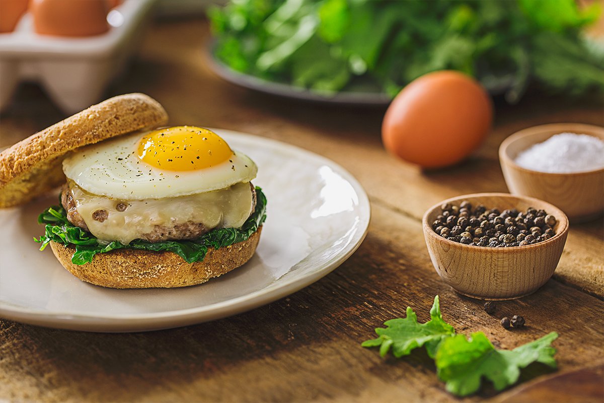 The combined flavors of sausage, Swiss, and baby kale are made perfect with the addition of a sunny egg on top.
