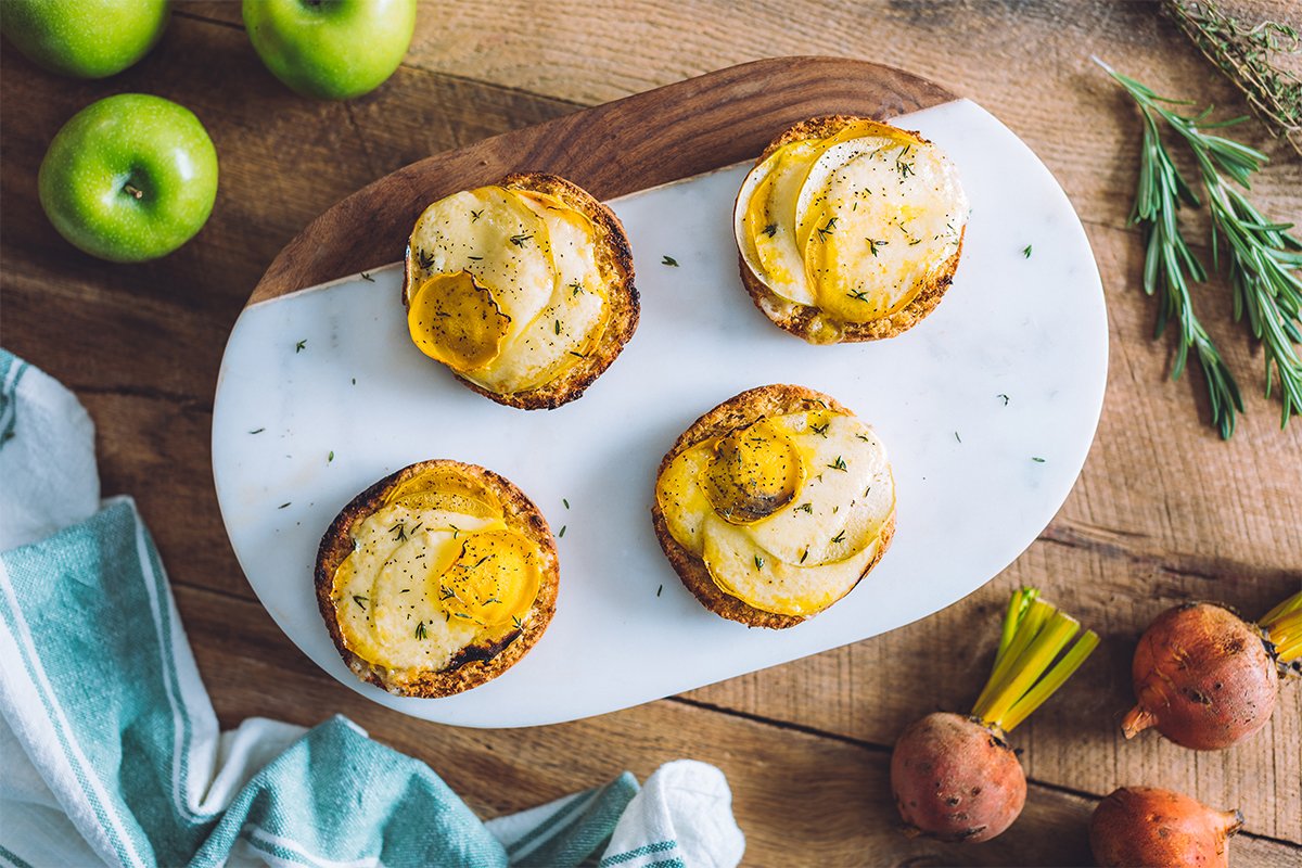 Thin-sliced rounds of apples and golden beets melted together with aged white cheddar over a toasty, buttered English Muffin.