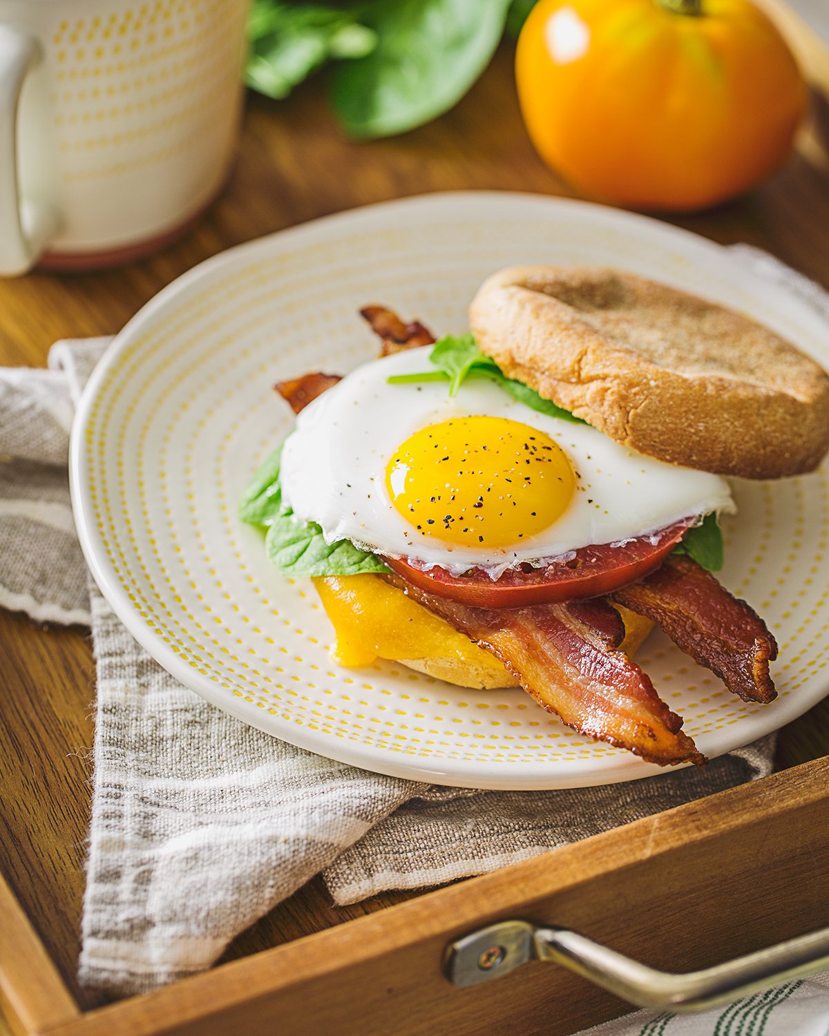 English Muffin with Bacon, Egg, Cheese & Salted Tomato