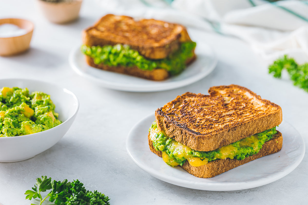 Savory green pea mash sandwiched with cheddar cheese on Country White Bread and grilled until crispy and golden.