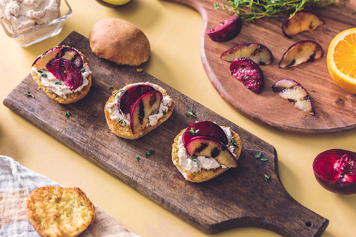 Grilled, honey drizzled stone fruits over a spiced mascarpone spread on Toasted Brioche-Style Rolls.
