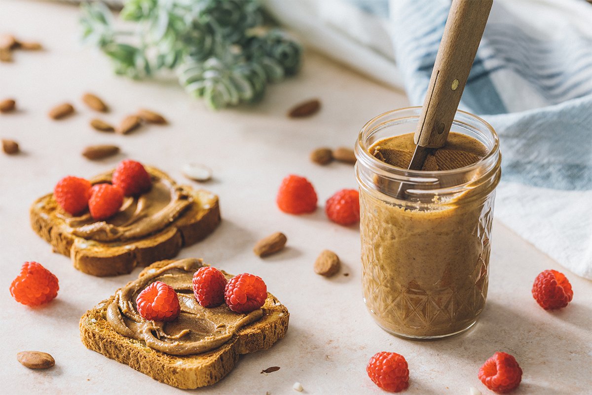Homemade almond butter with raw honey and fragrant cardamom - perfect on toasted Country White bread.