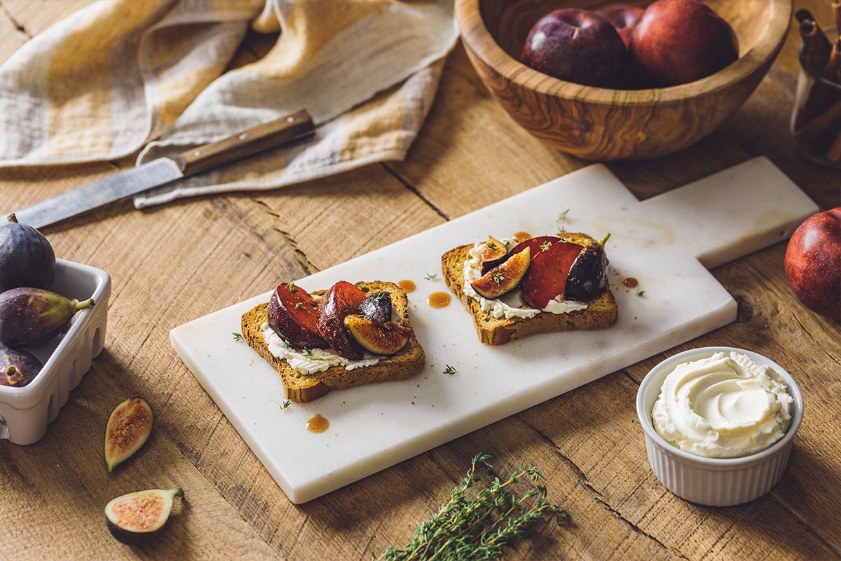 Mascarpone cheese spread on toast topped with sliced ripe figs and plums tossed with a spiced honey mixture and garnished with fresh thyme leaves.