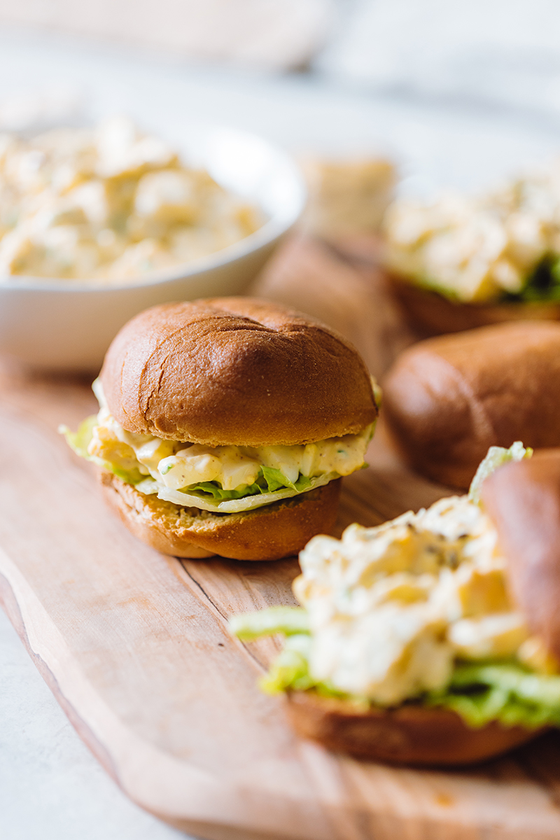 These mini sandwiches are perfect for sharing and a delicious way to welcome in spring with a creamy egg salad and fresh veggies for a satisfying crunch.