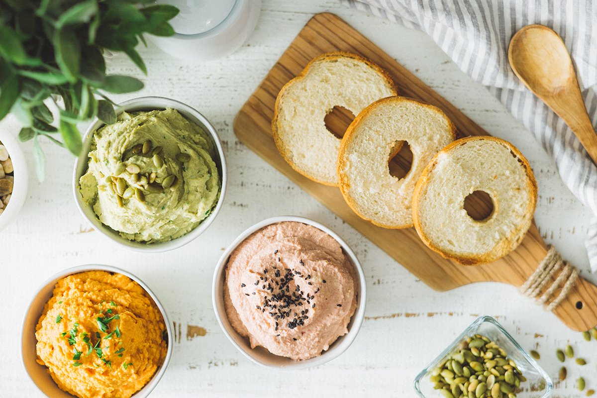 One basic hummus recipe combined with colorful veggies for 3 deliciously different bagel dips.