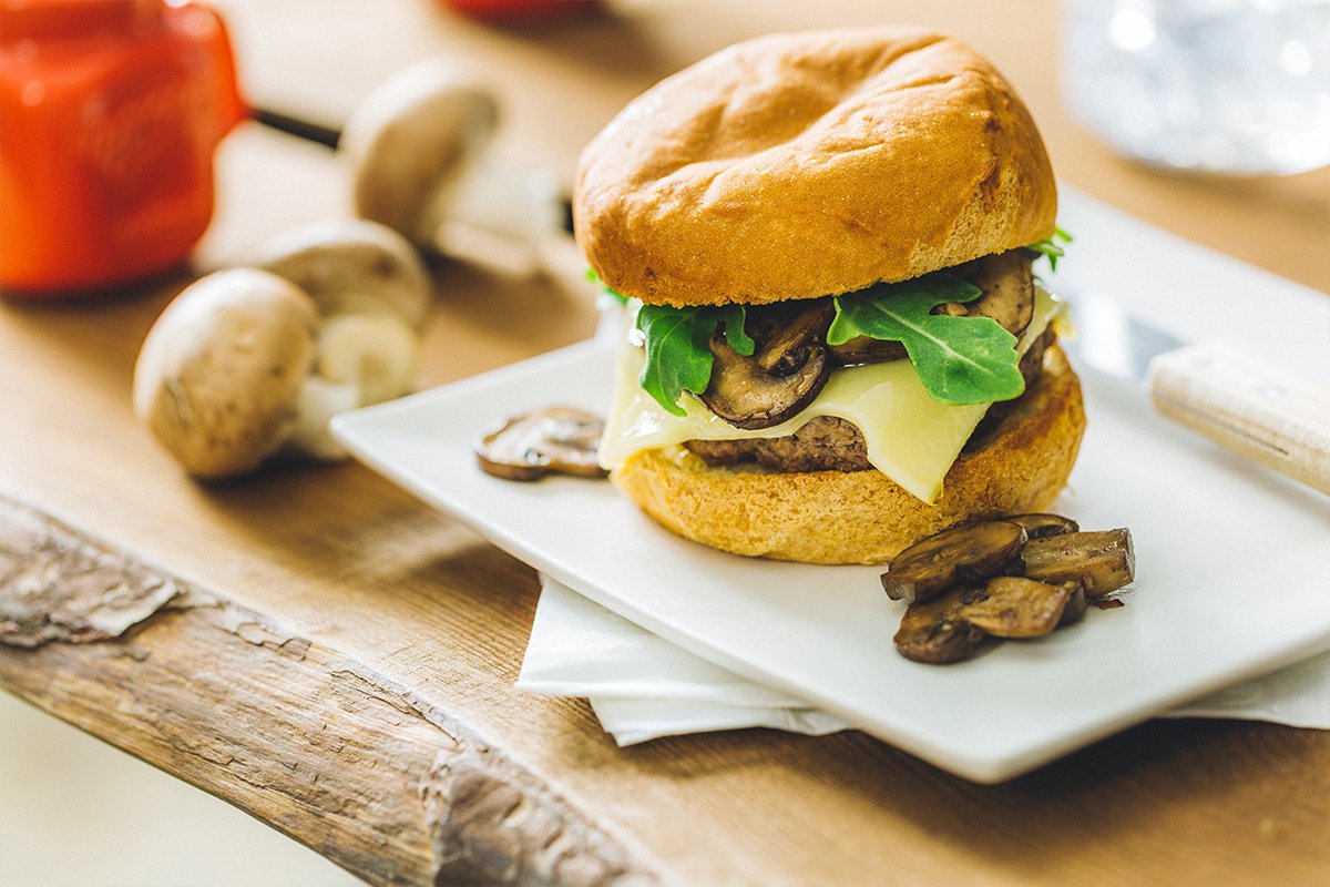 Savory sautéed mushrooms and melted Swiss on a perfectly seasoned burger with peppery greens.