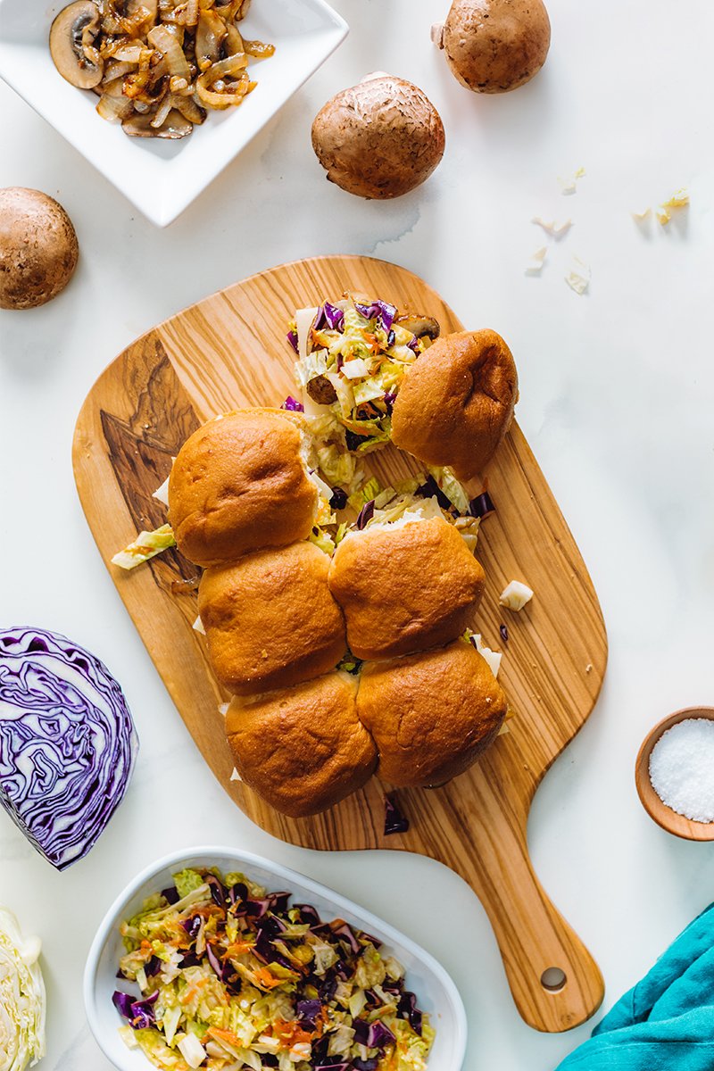 Mushroom Swiss Sliders with Tangy Cabbage Slaw