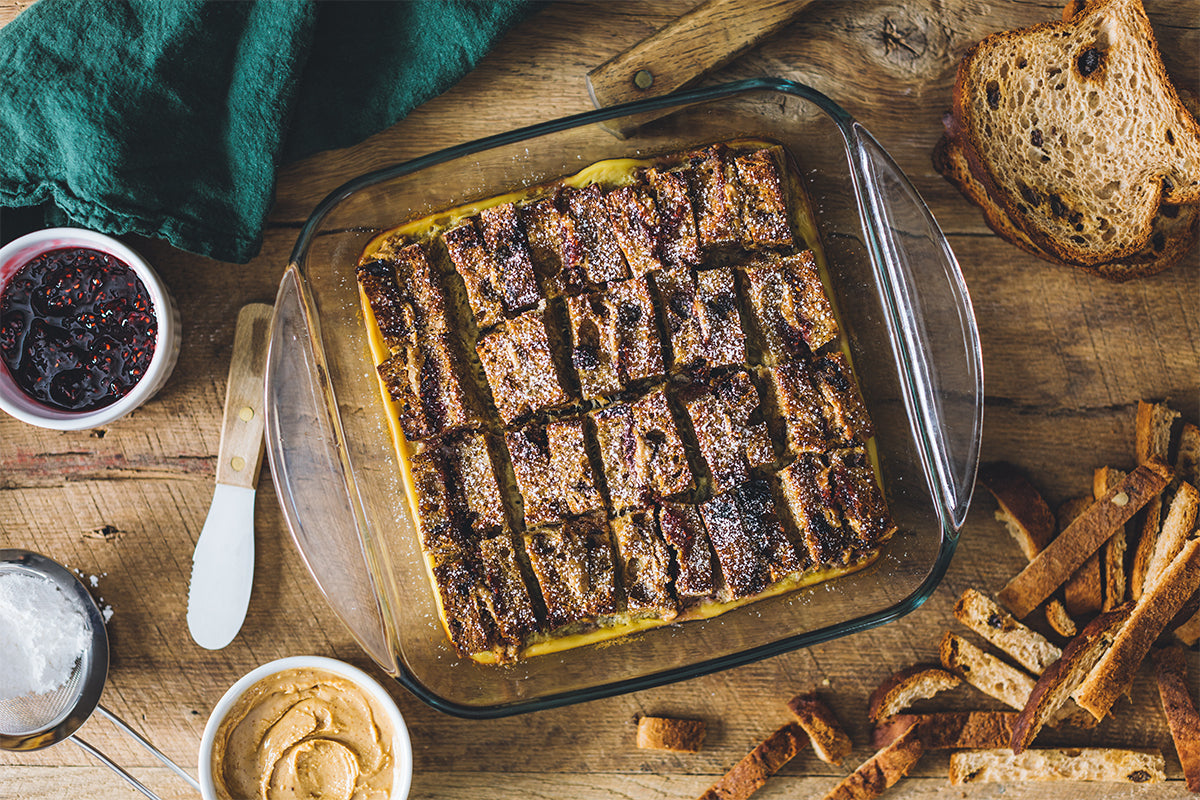 Cinnamon Raisin Bread spread with peanut butter and raspberry preserves, then baked in creamy custard for a sweet and nostalgic breakfast treat.