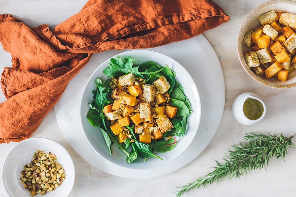 Roasted herbed butternut squash and cubed Ancient Grain bread drizzled with honey Dijon dressing over hearty salad greens.