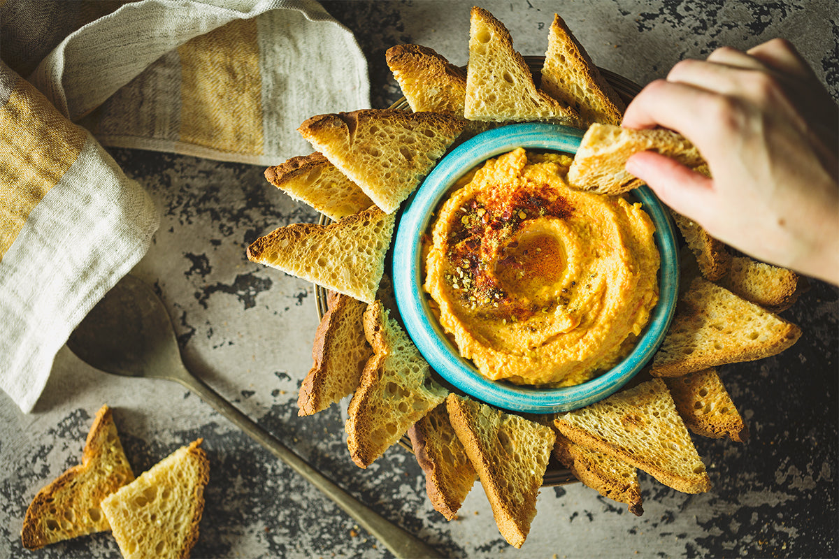 This flavorful hummus dip made with roasted root veggies and harissa makes a colorful and satisfying snack.