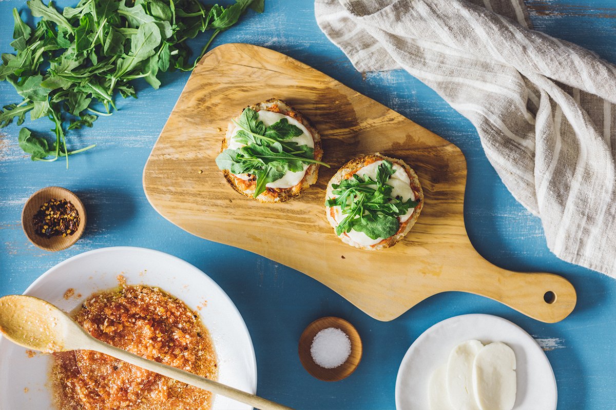 Fresh, cookless tomato sauce layered on a toasted English muffin with melted mozzarella and a generous topping of peppery arugula.