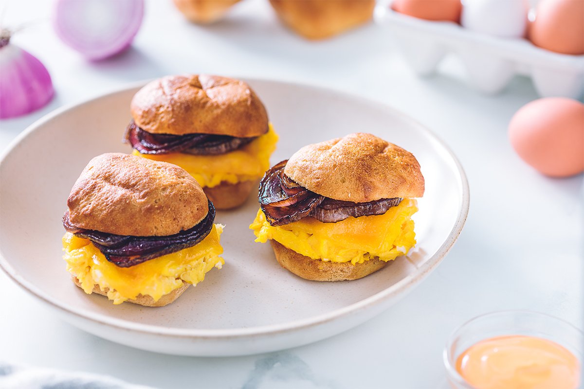 Scrambled Egg and Cheese on Brioche with Caramelized Onions and Chipotle Mayo