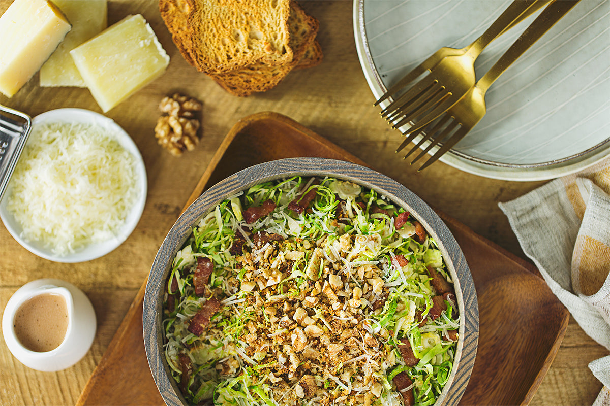 A comforting salad made with thick and crispy pancetta, toasty gluten-free breadcrumbs and creamy gruyere cheese on shredded brussels sprouts.