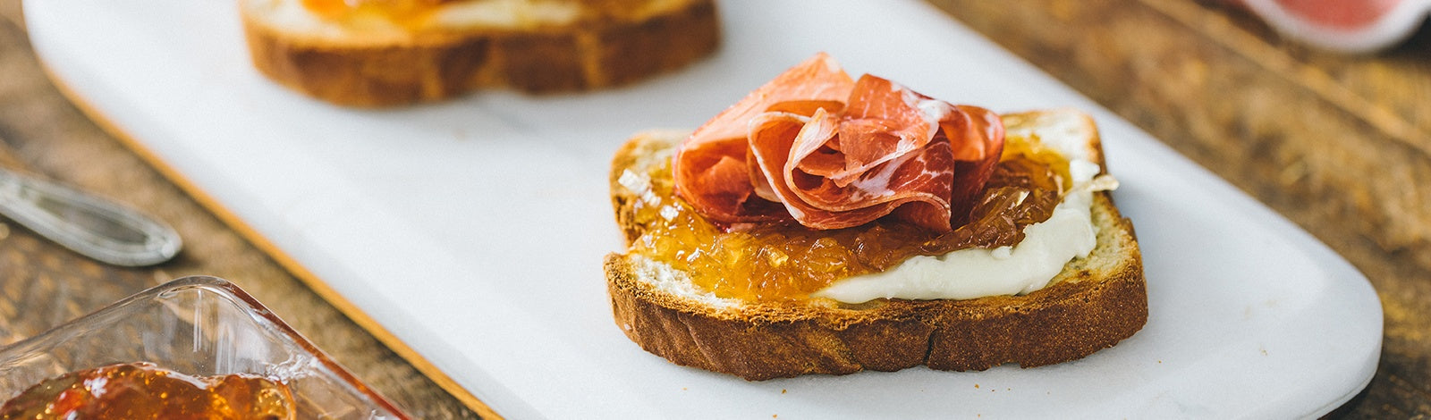 A simple, impressive snack with French Triple Cream, cranberry sauce made with caramelized onions and dry-cured pork on toasted Country White Bread.