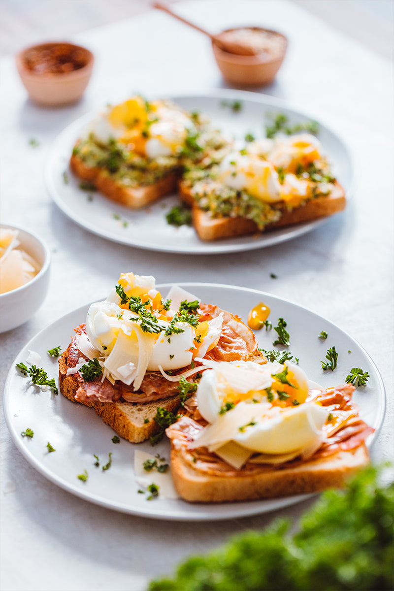 Crispy gluten-free sourdough-style toast layered with either creamy avocado or savory prosciutto, topped with smashed eggs for the ultimate open-faced breakfast. A simple yet gourmet dish packed with flavor and texture.