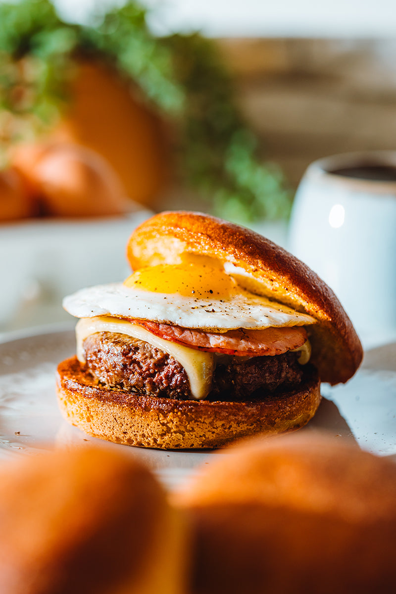 Start your day with a flavor-packed breakfast burger, featuring a juicy patty, savory deli ham, gooey melted cheese, and a perfectly cooked egg, all on a Canyon Bakehouse Brioche-Style Hamburger Bun.