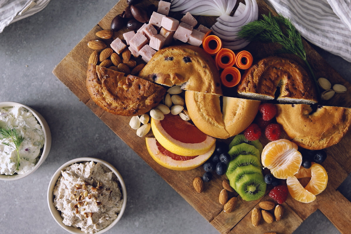 Brunch fare served family style, including quartered bagels with sweet and savory toppings and two heavenly cream cheese spreads.