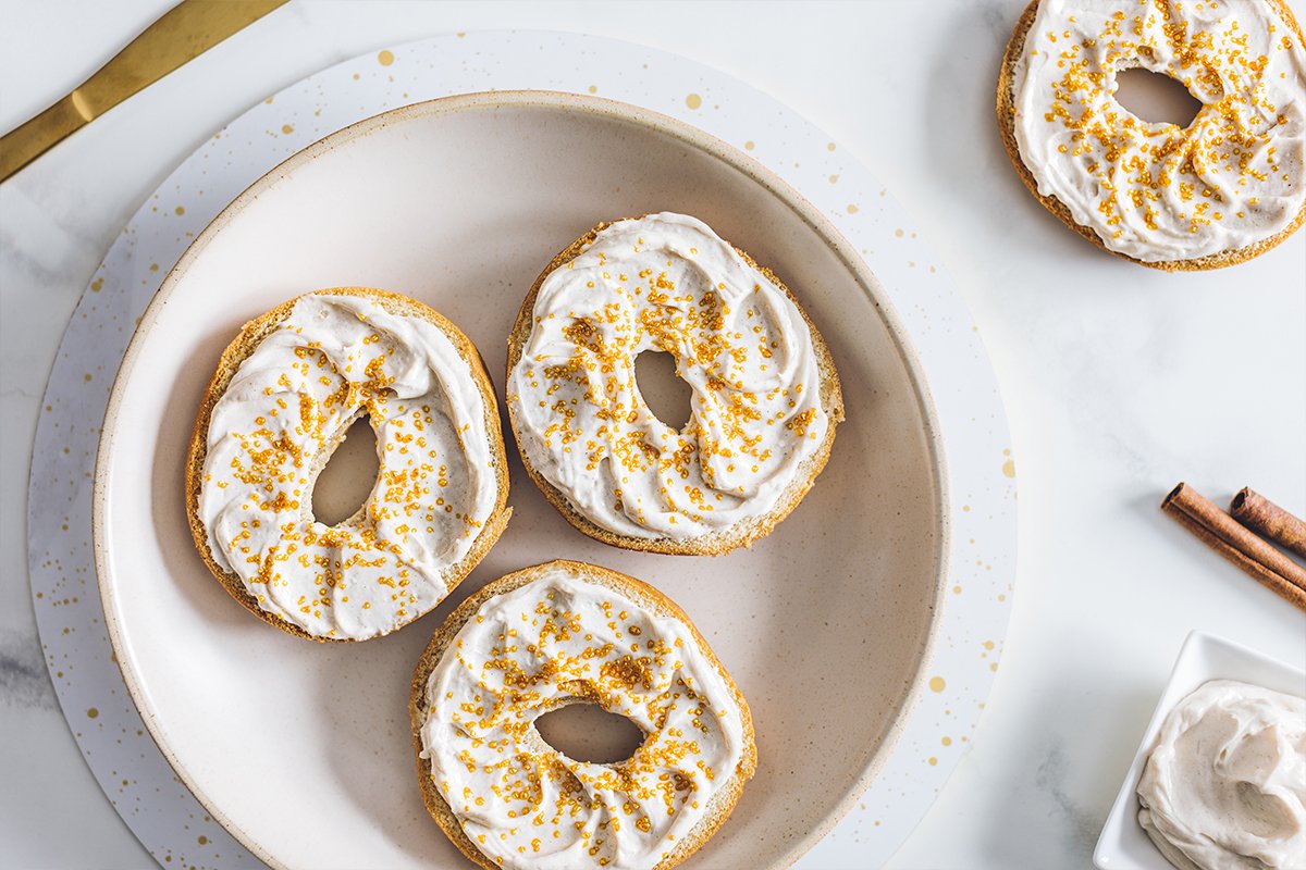 Toasted Deli White Bagels with subtly spiced dairy-free cream cheese and celebratory sprinkles.