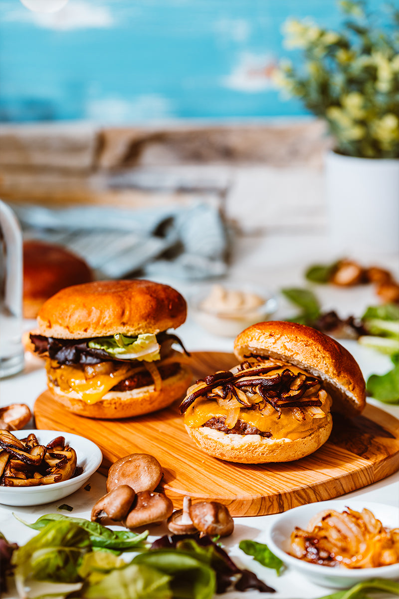 This gourmet burger features juicy mushrooms, caramelized onions, melted cheese, fresh greens, and a rich truffle aioli sauce, all nestled between soft Brioche-Style Hamburger Buns.