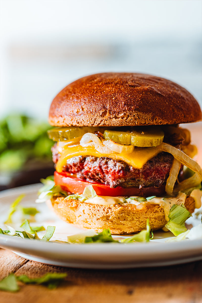 Grill up the ultimate Smash Burger with perfectly seasoned, crispy-edged patties, melted cheddar, and a tantalizing smash sauce, all nestled on a gluten-free Brioche-Style Hamburger Bun for an irresistible, mouthwatering experience.