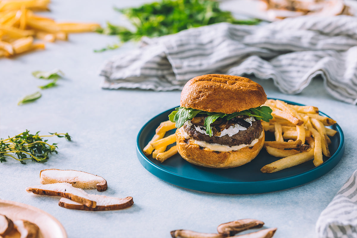 Wild mushrooms sautéed with garlic, shallots, and white wine on a grass-fed beef burger with goat cheese and greens.